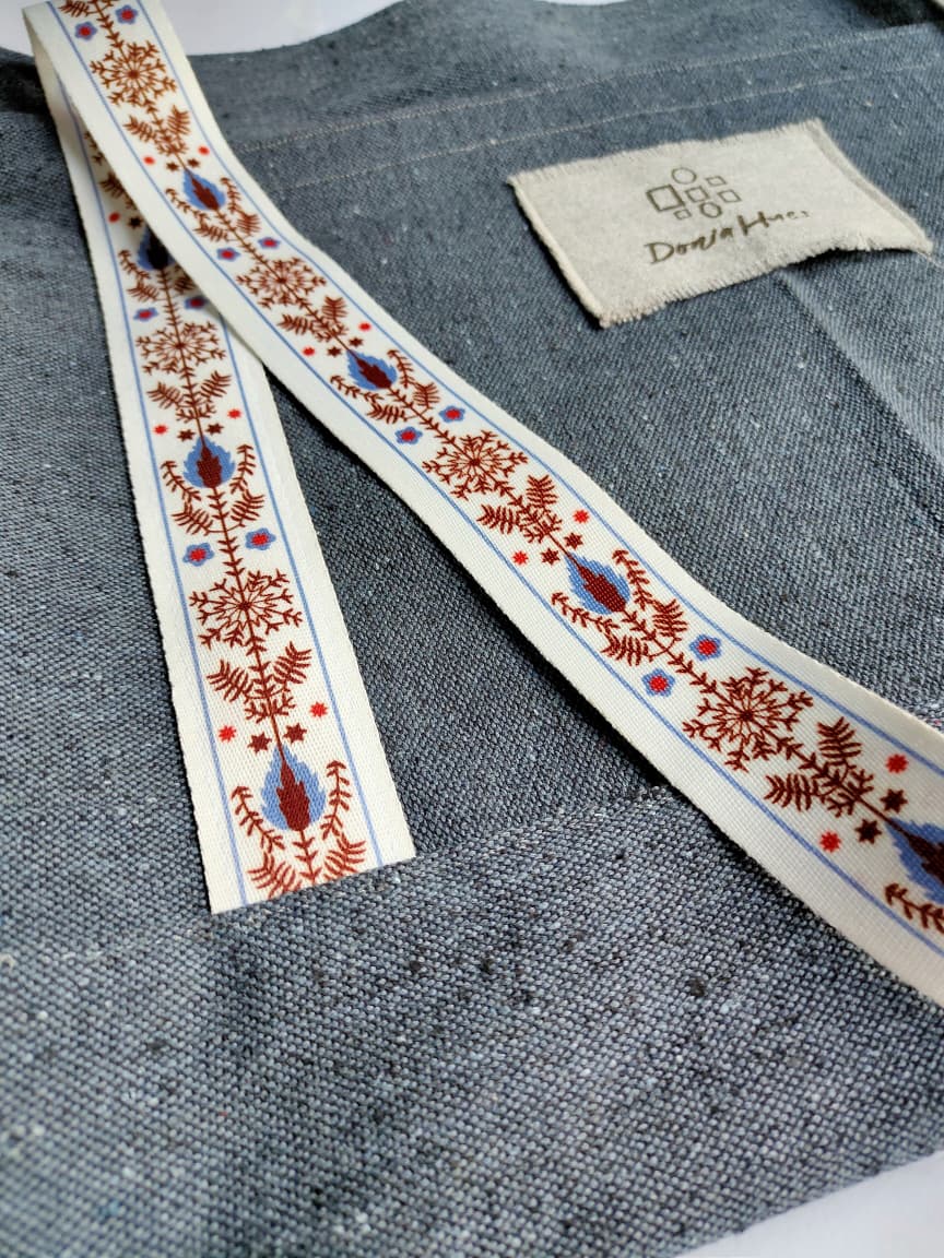 Its white woven strap, adorned with gold, light blue, and burgundy patterns, adds a gentle touch of warmth and artistry — perfectly complementing the bag’s muted base.