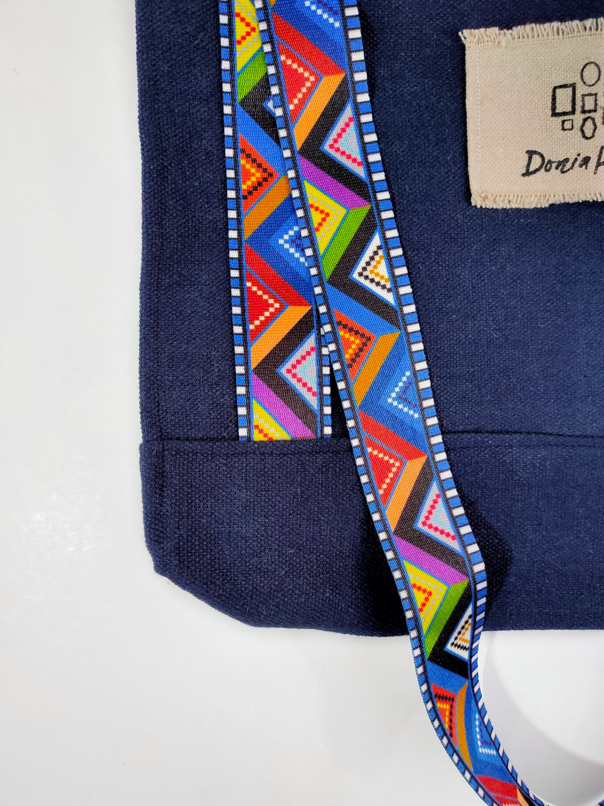 Crafted from heavy duck cotton in deep navy, and finished with a multi-colored woven handle, it brings a bold artistic touch to every detail.