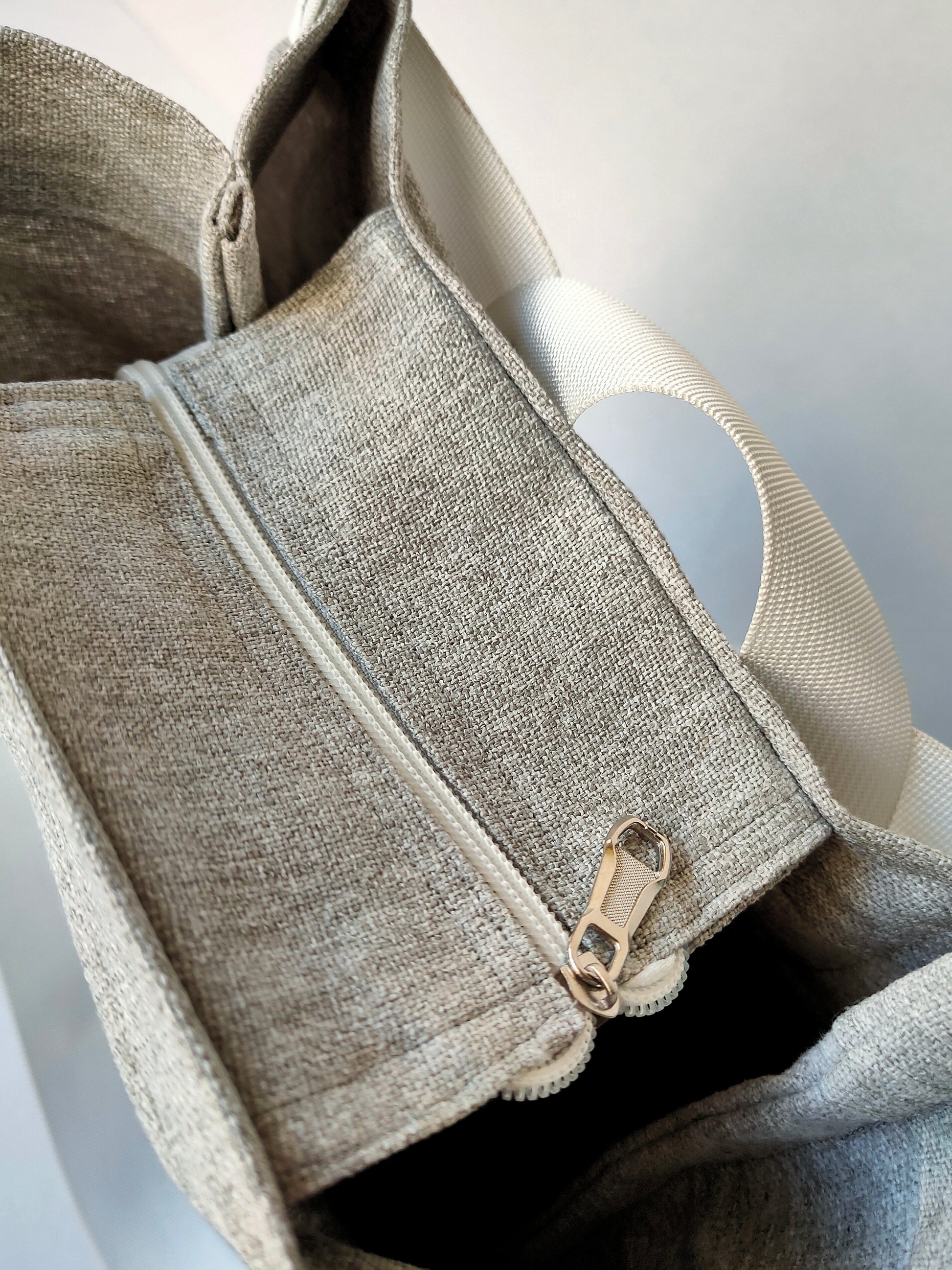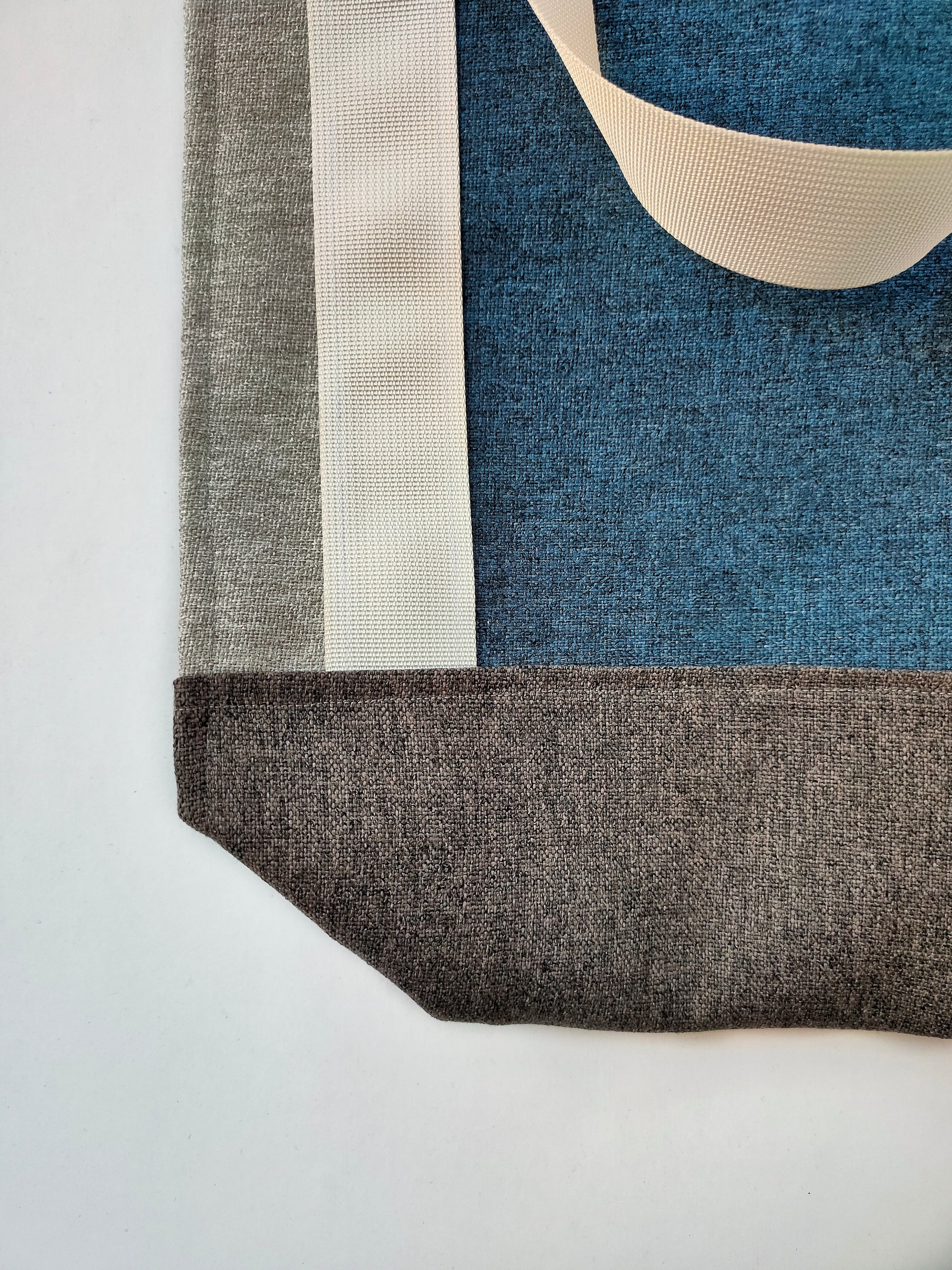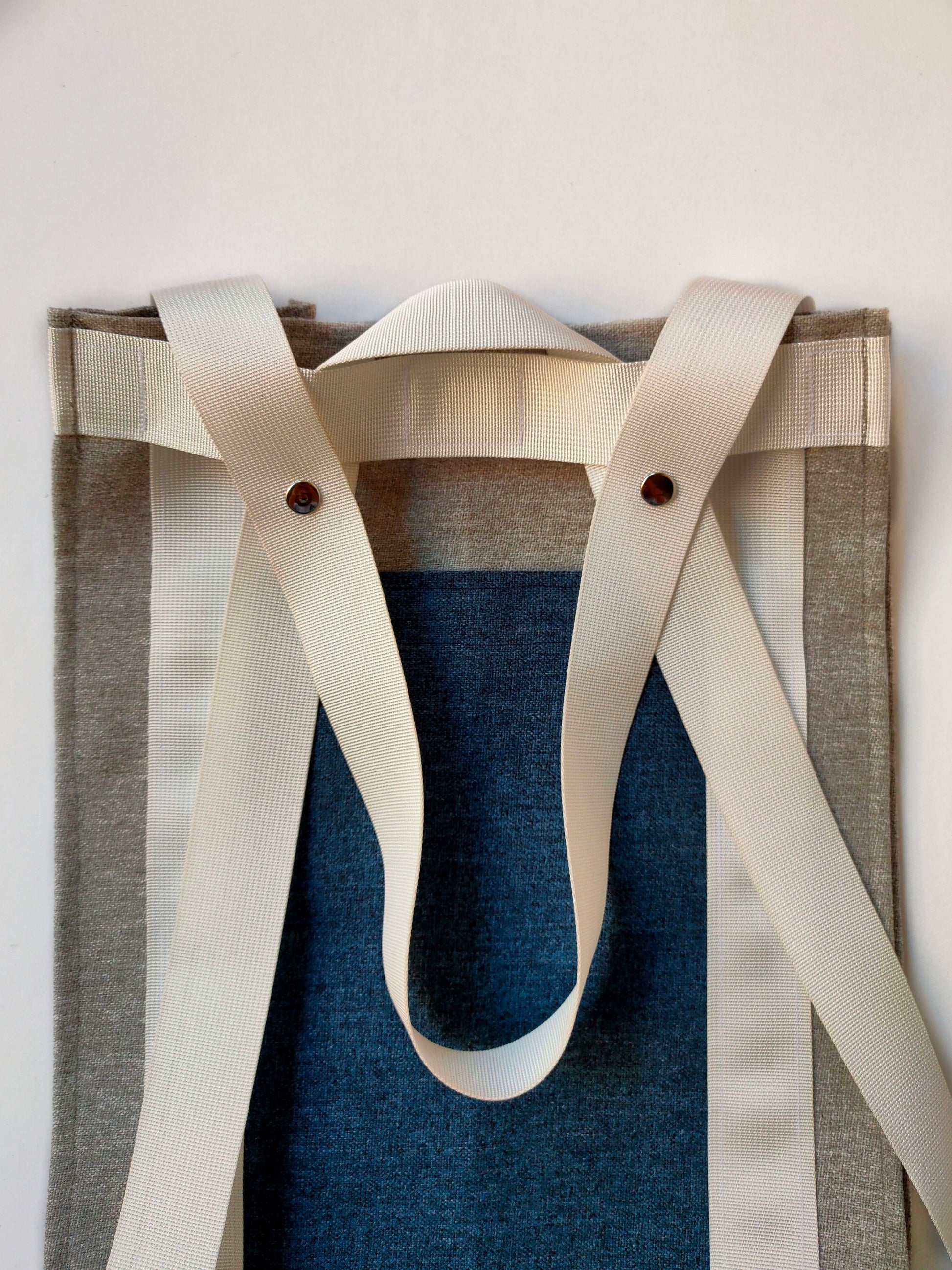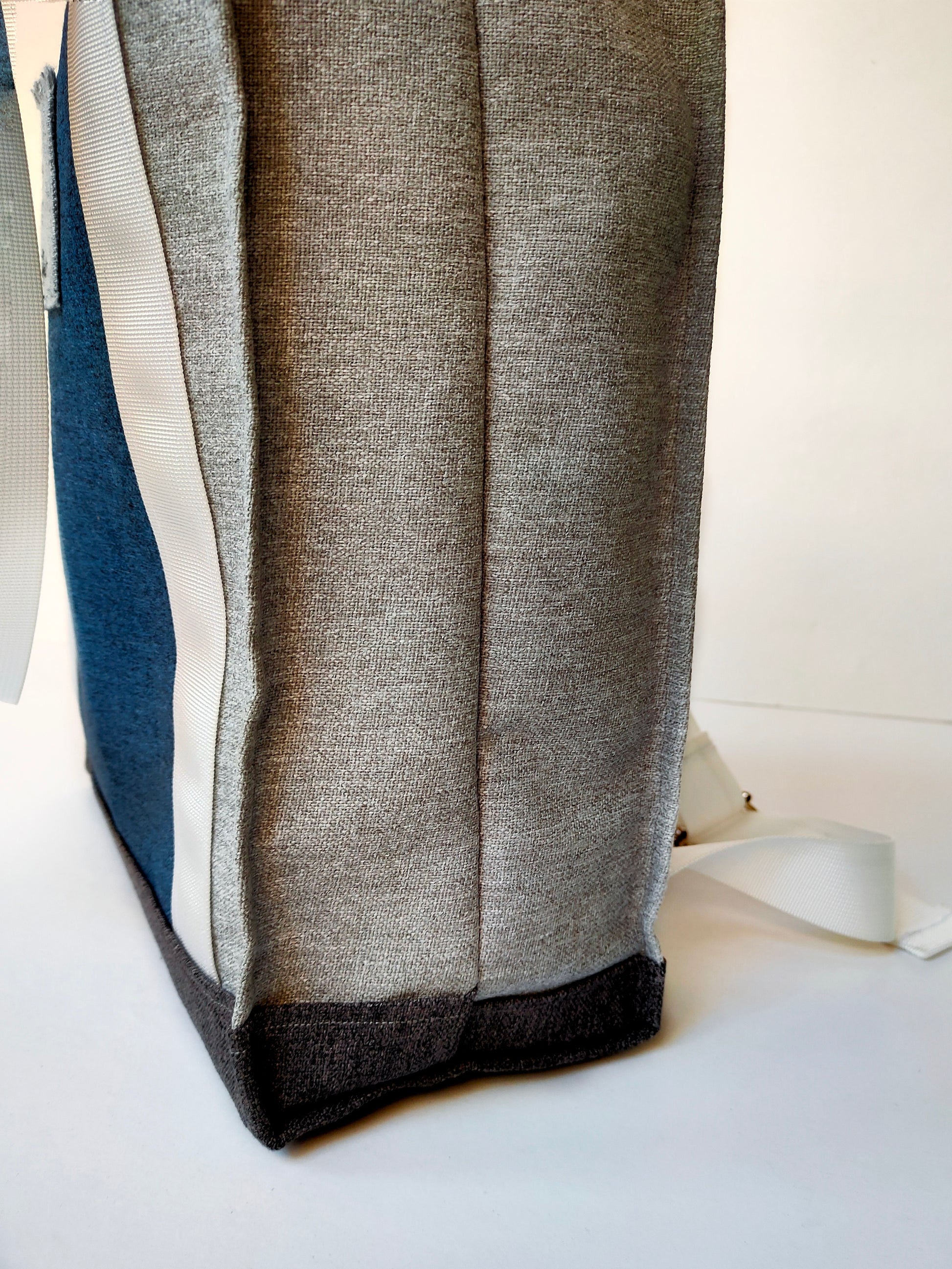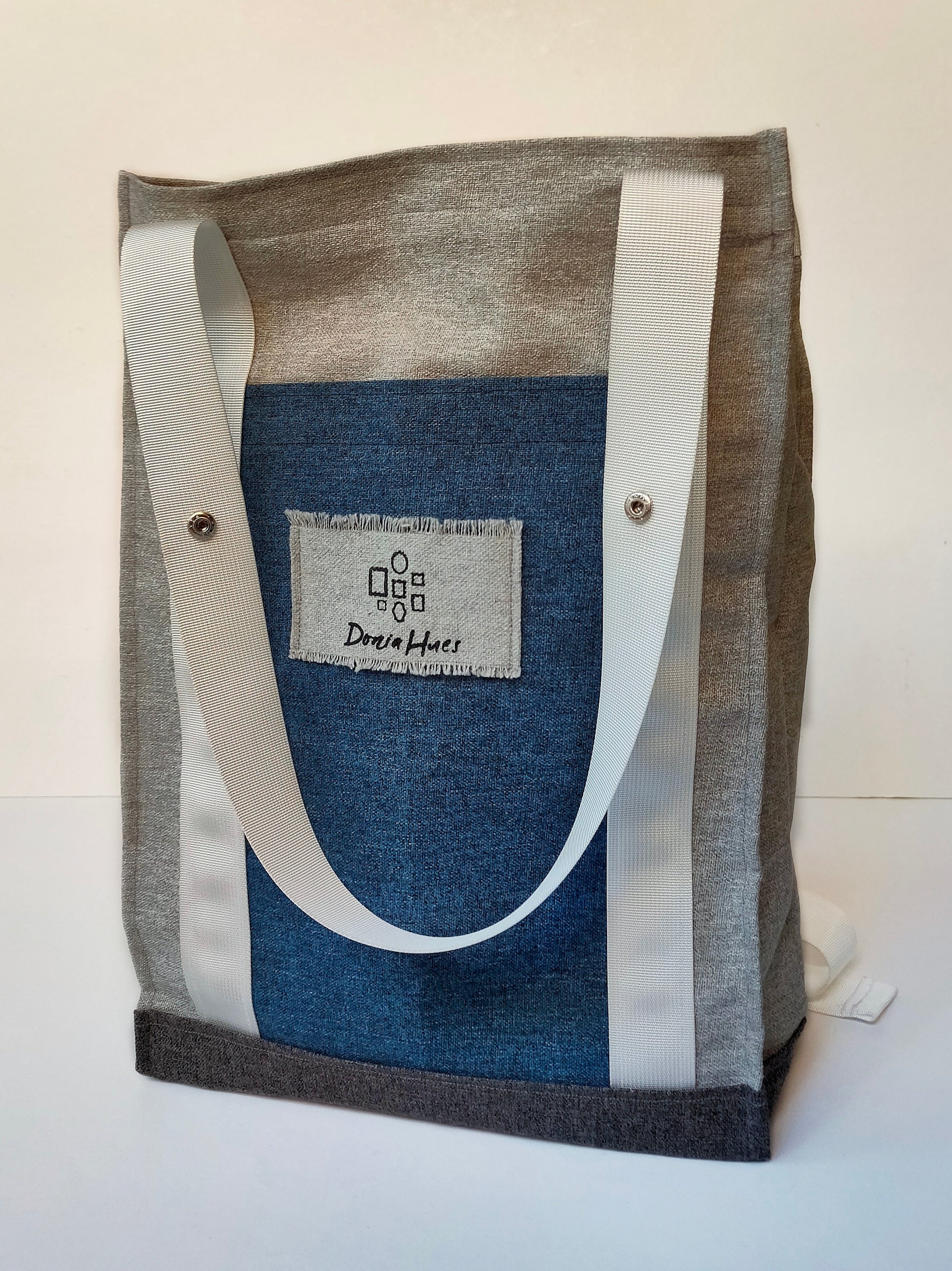 A soft blend of light grey, deep charcoal, and bluish navy, paired with clean white straps, makes the Luna Mini a calm yet eye-catching everyday bag.
