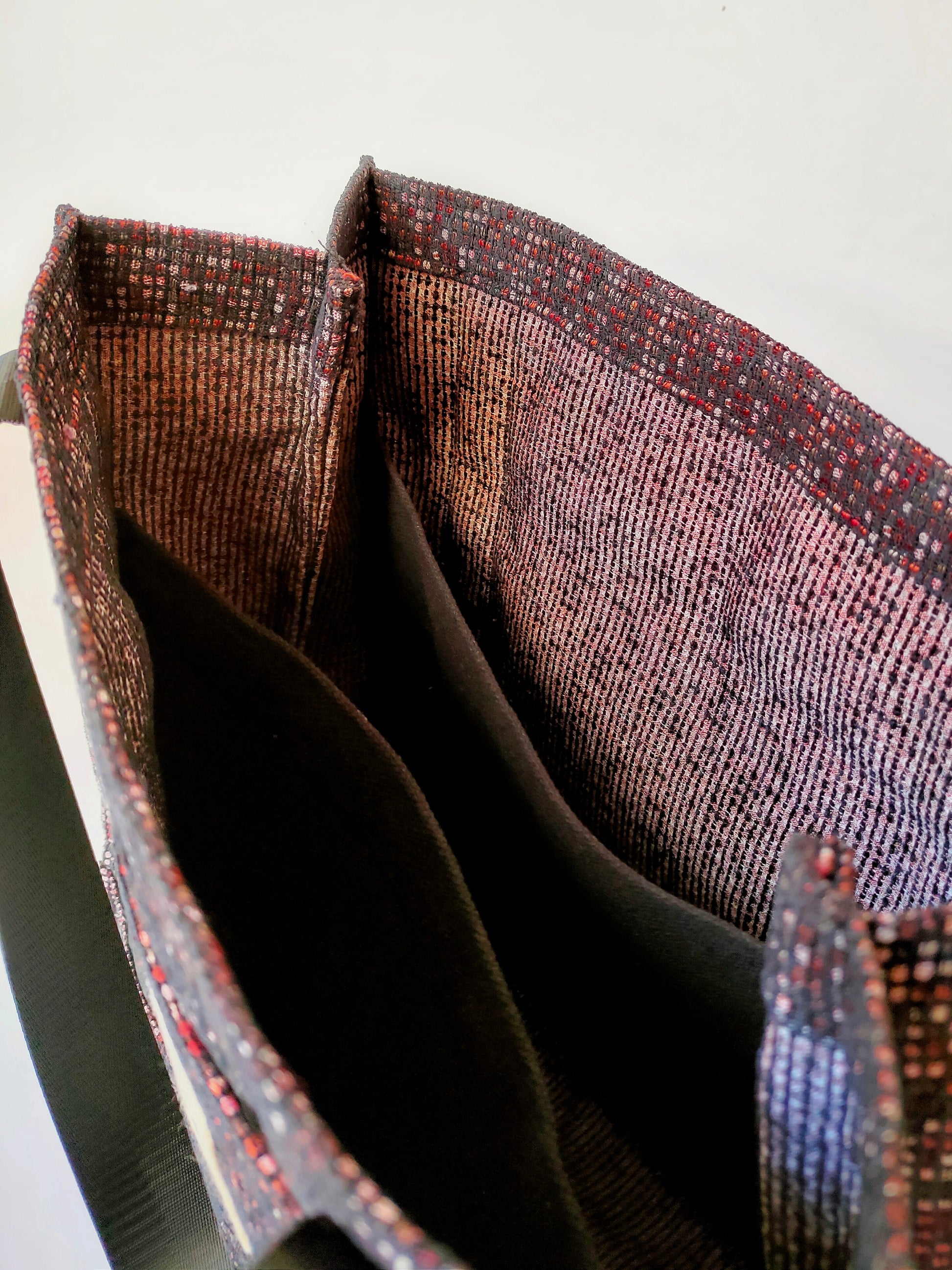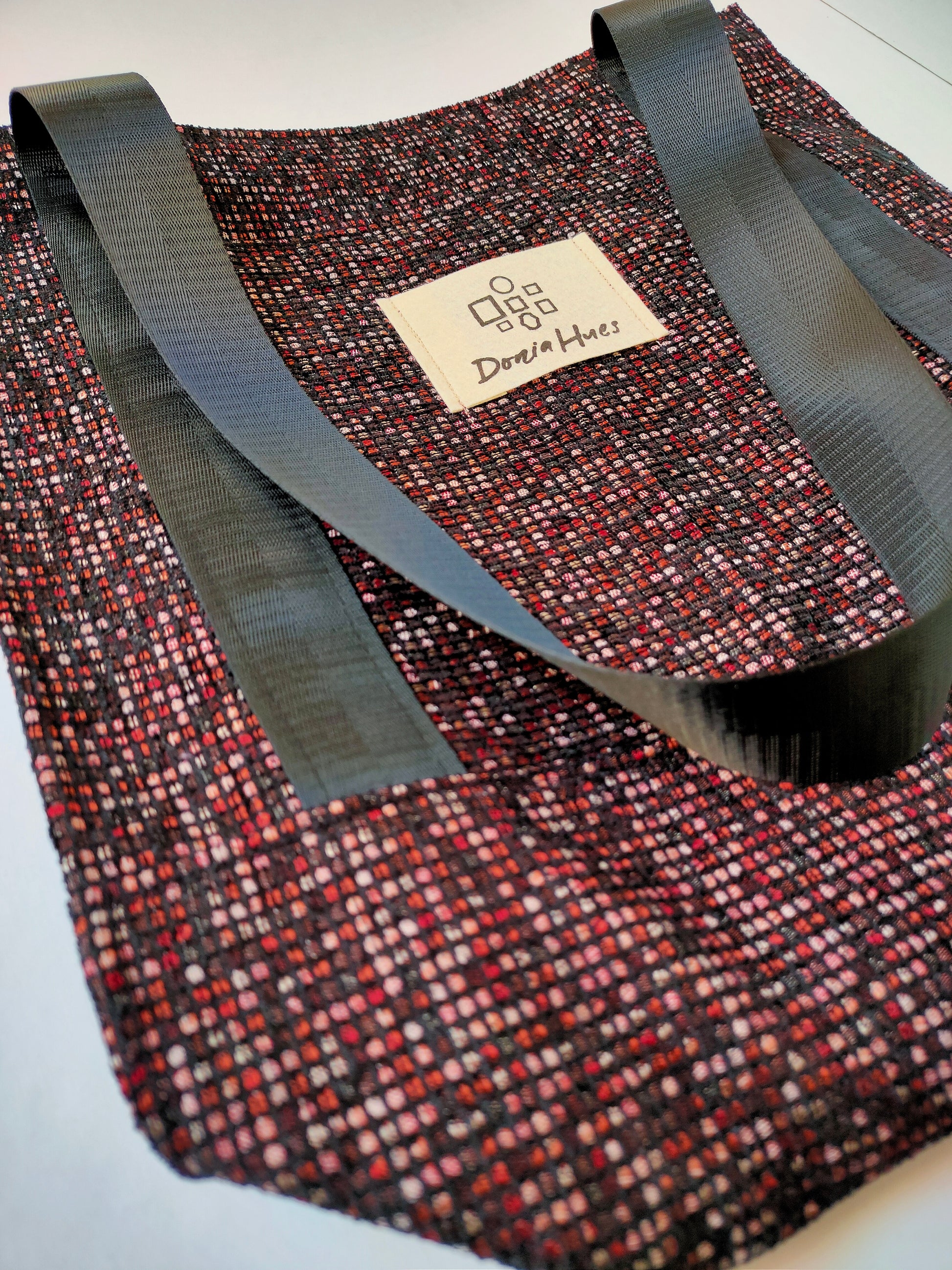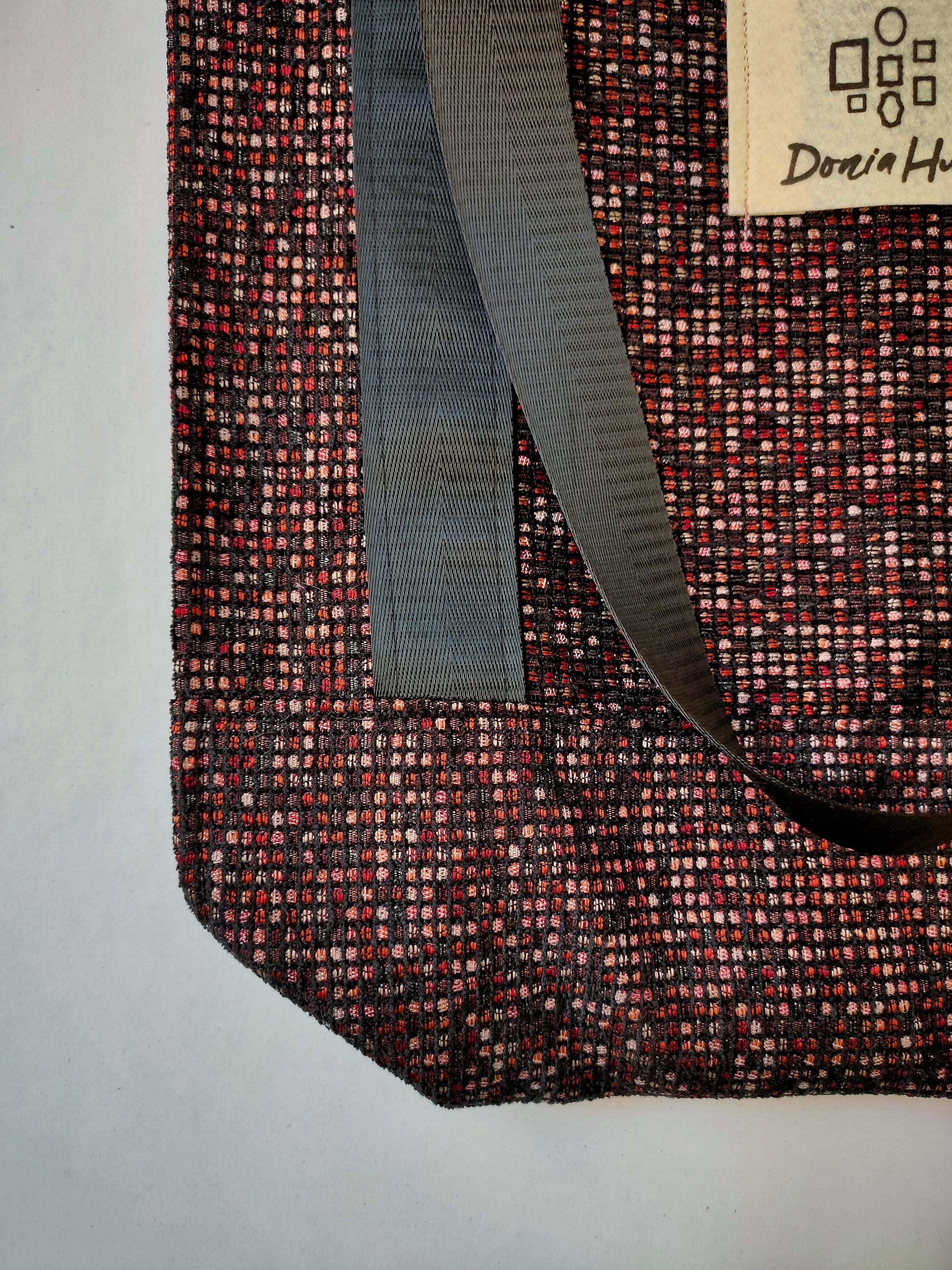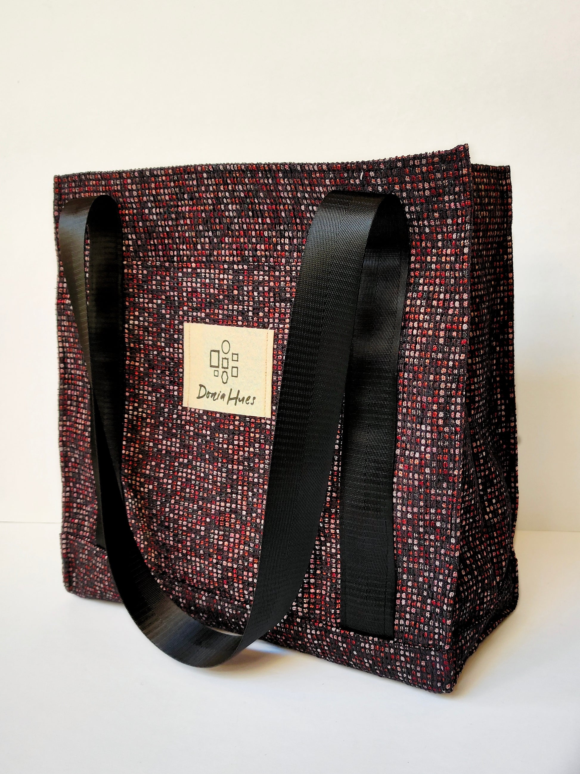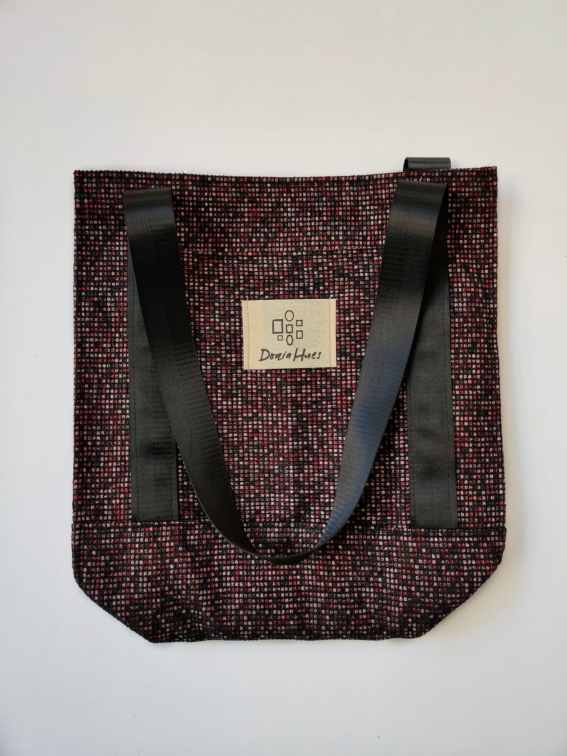 A unique mini tote crafted from small checkered black fabric with touches of red and pink for a modern, bold finish. Compact, versatile, and ideal for quick errands or daily use with a subtle artistic edge.