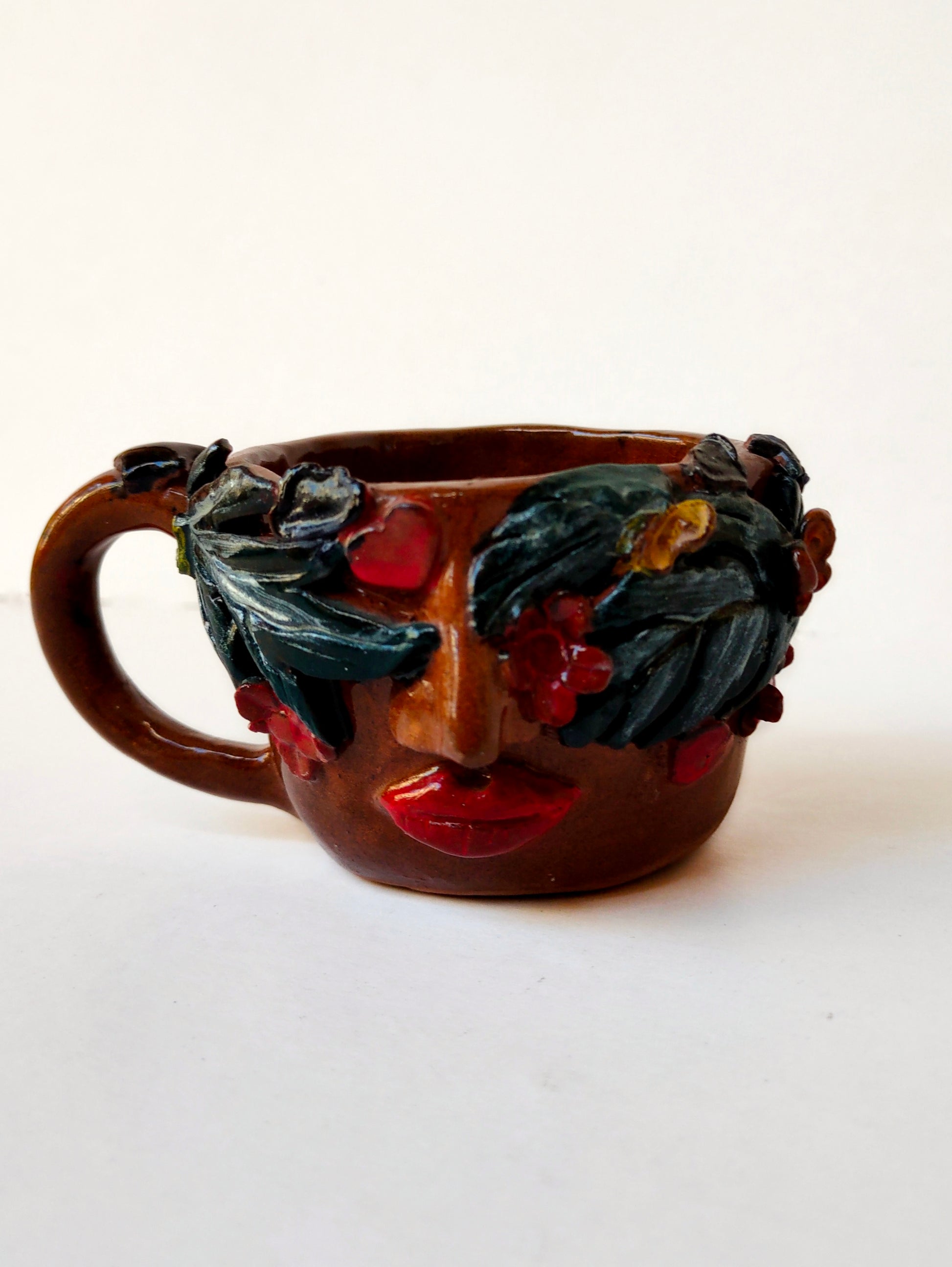 A true statement piece and a work of wearable art. This mug features a meticulously hand-sculpted face entwined with lush green leaves and vibrant red floral accents. The rich brown glaze enhances the organic, "Mother Earth" feel of this unique vessel.