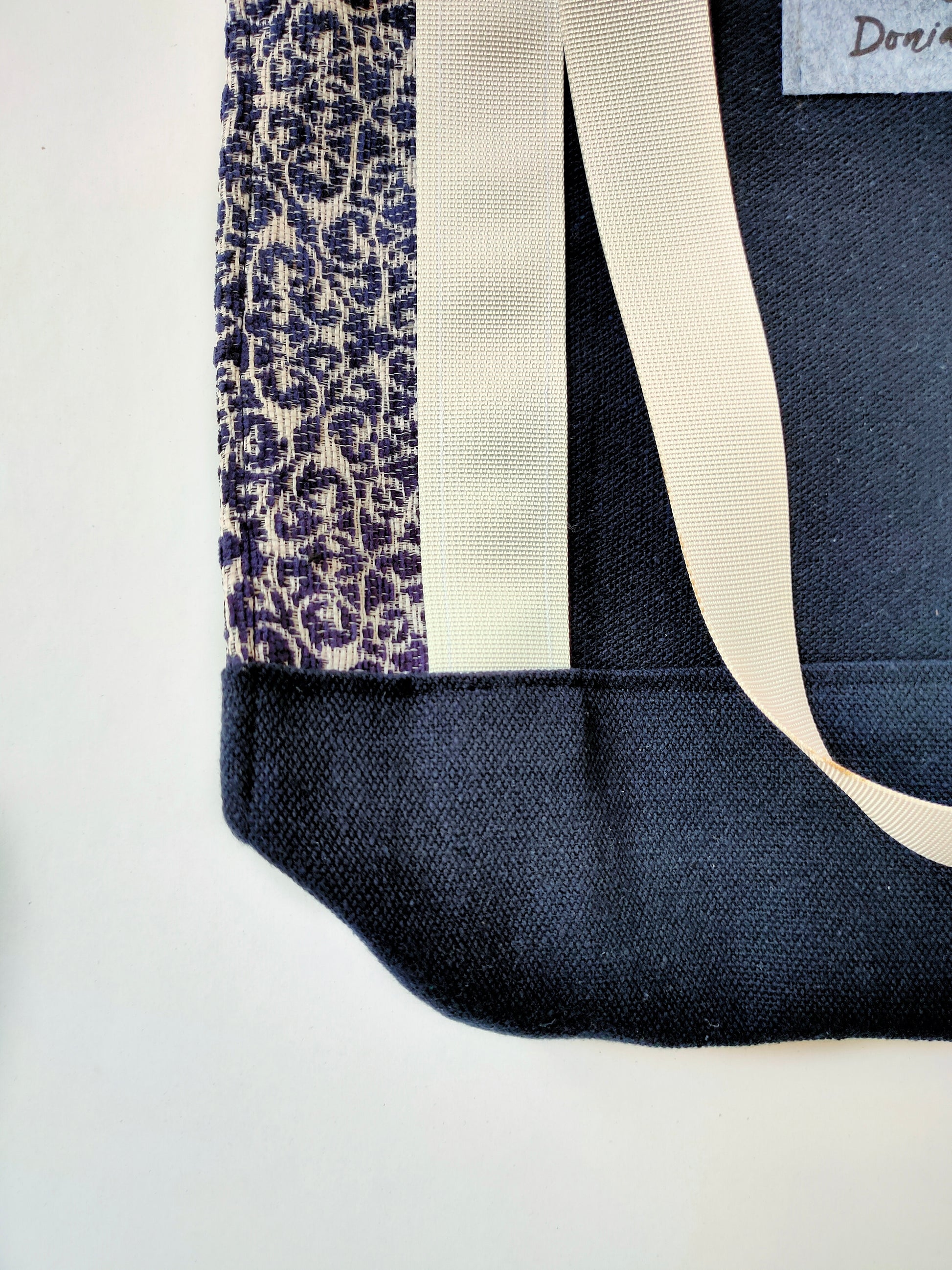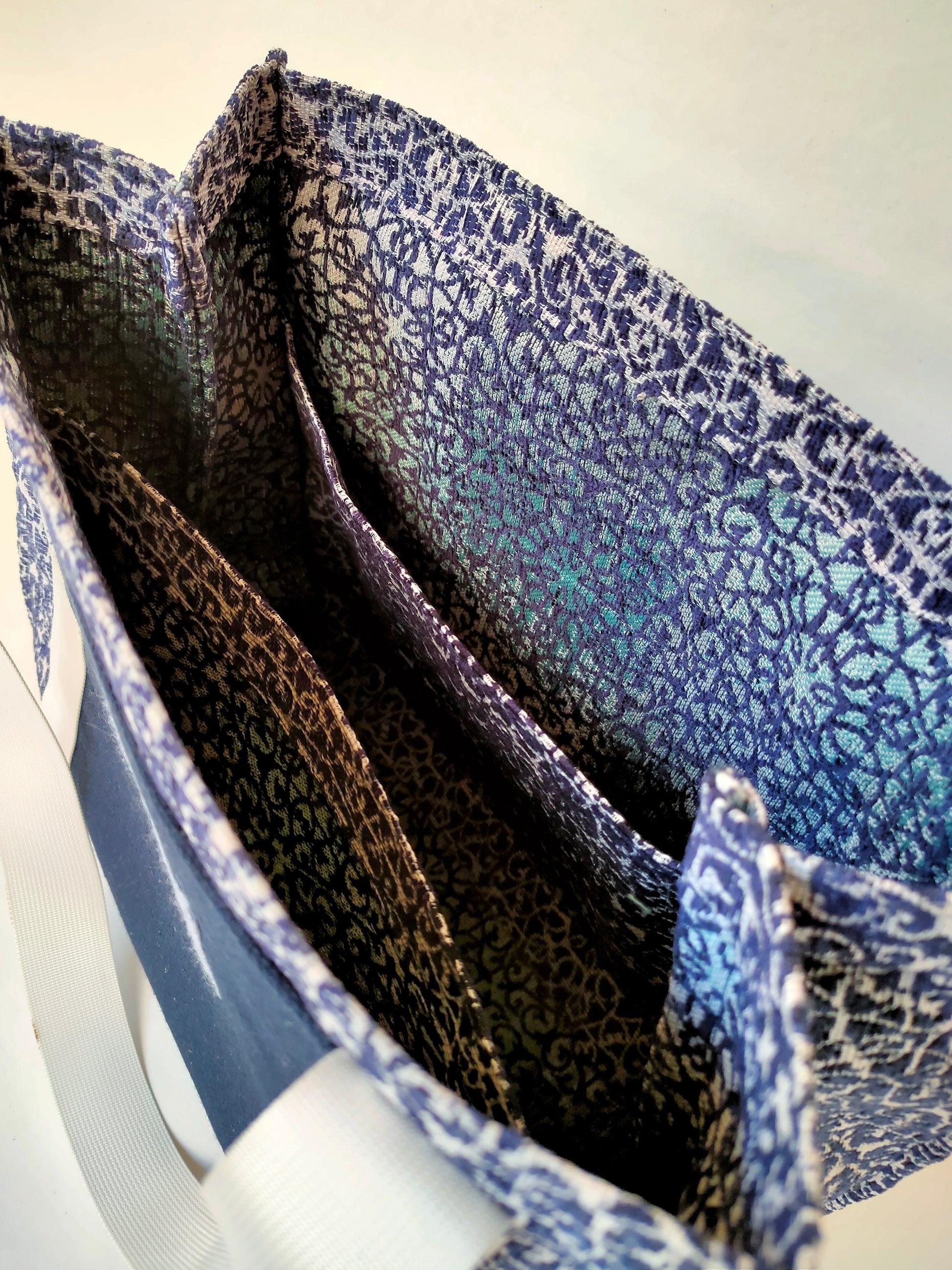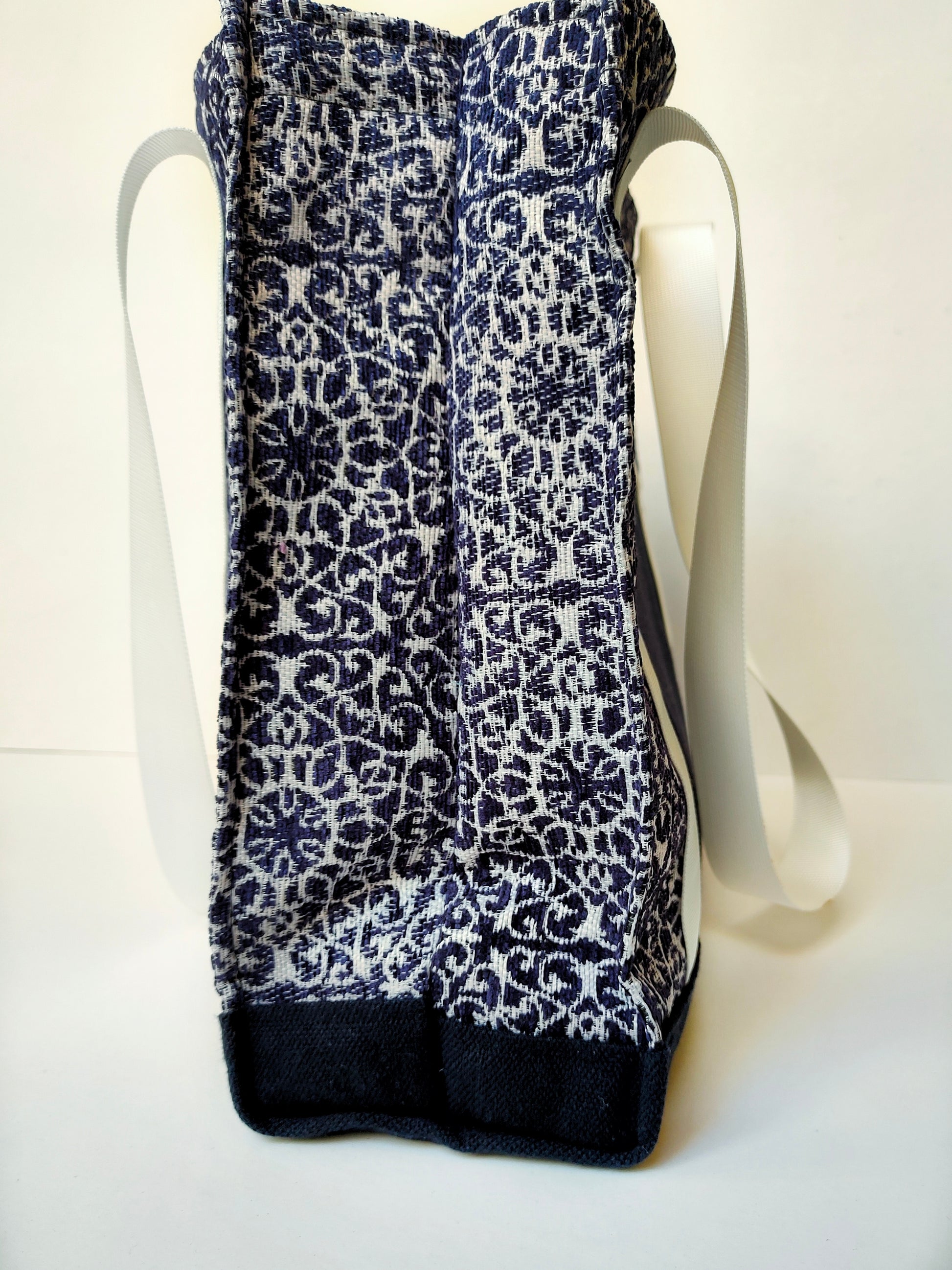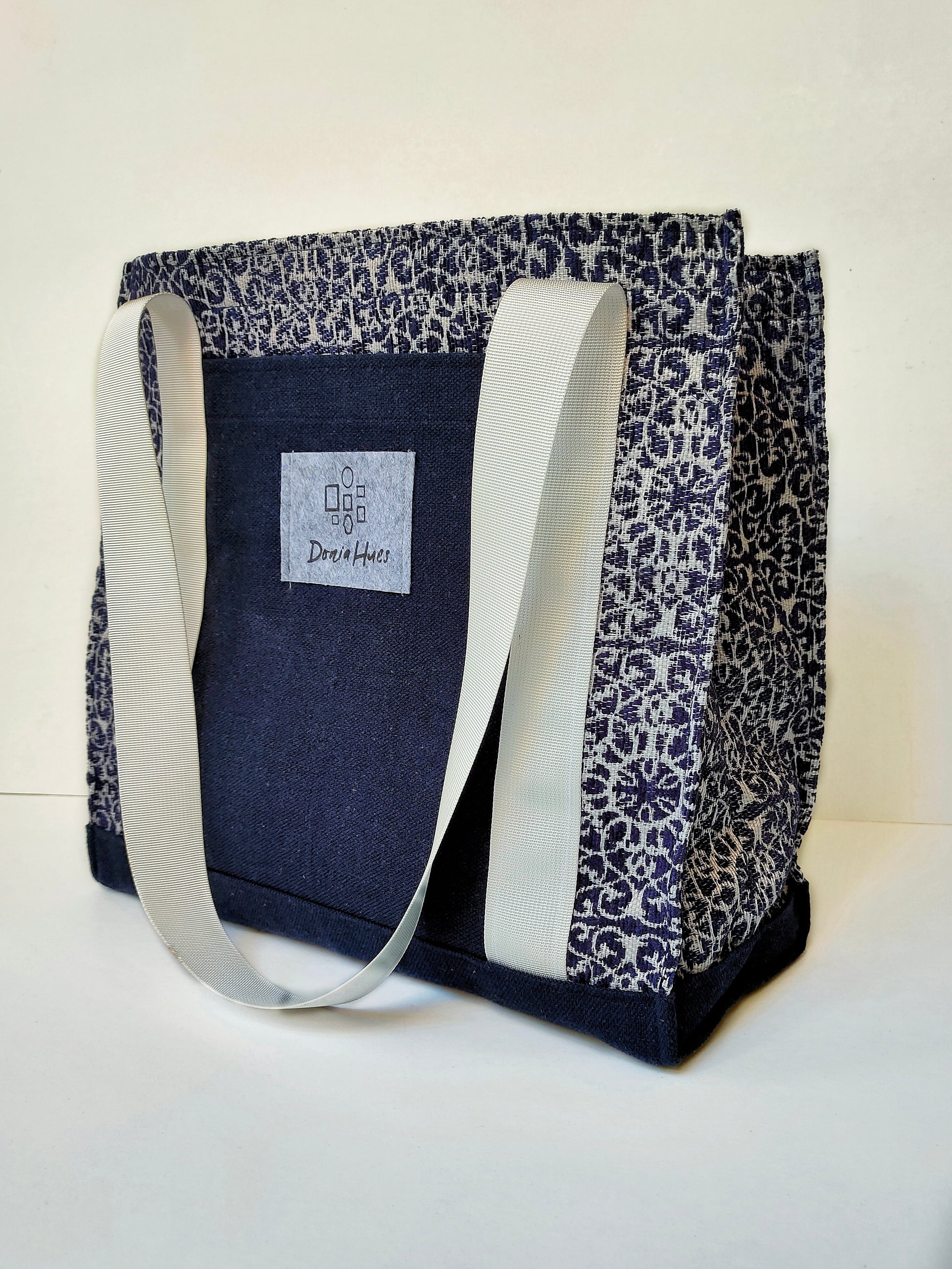 A clean and stylish mini tote featuring a navy-and-white patterned body balanced with a simple white strap. Minimal, practical, and effortlessly chic — ideal for everyday use and for anyone who loves subtle artistic details.